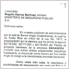“Carta de Vanesa Castro al Ministerio de Seguridad”: La Directora Ejecutiva del Banco Popular, en ese momento la licenciada Vanessa Castro López, envía al Ministro de Seguridad, licenciado Rogelio Ramos Martínez, sobre la “preocupación por la demora que ha tenido la ejecución del desalojo, donde se ubica el proyecto bananero de las empresas Bananera Chánguina” de fecha 11 de julio de 2002.